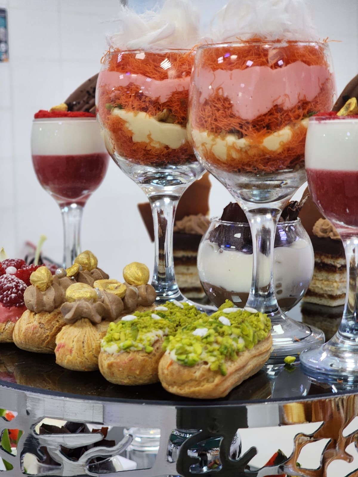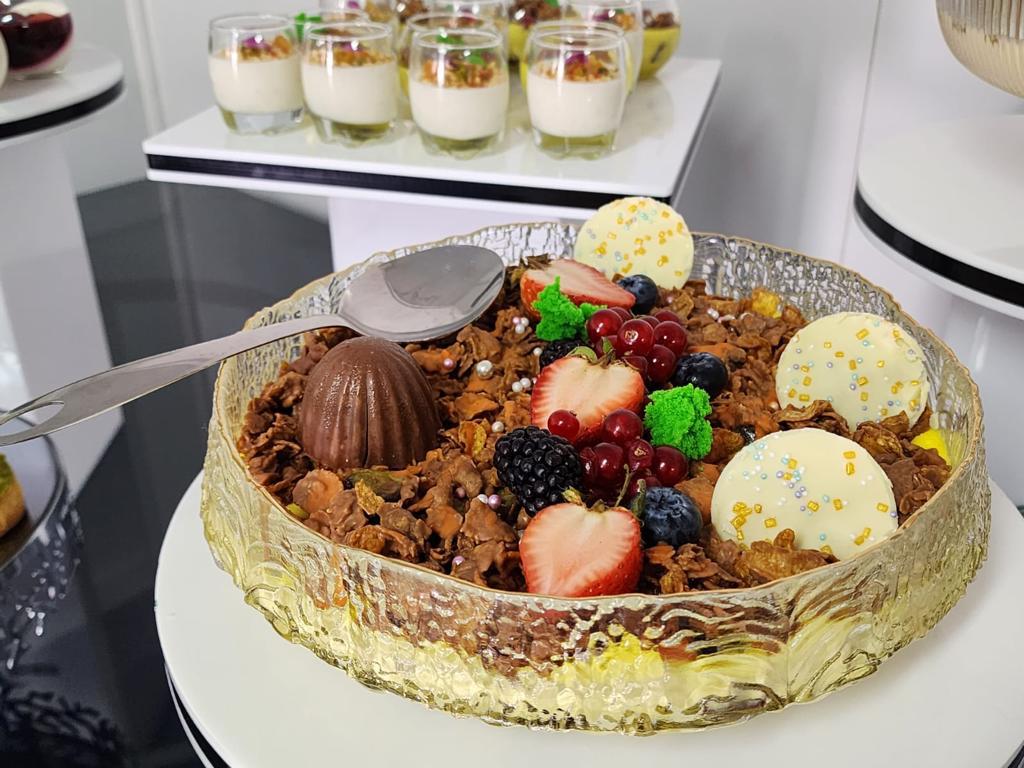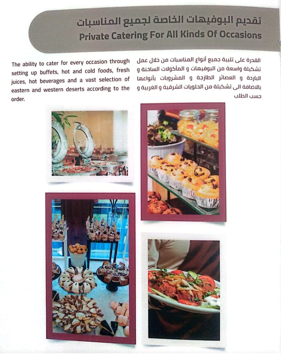 القدرة على تلبية جميع أنواع المناسبات من خلال عمل تشكيلة واسعة من الوفيهات والمأكولات الساخنة والباردة والعصائر الطازجة والمشروبات بأنواعها بالإضافة إلى تشكيلة من الحلويات الغربية وحسب الطلب.